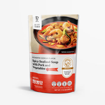Jjamppong Tang, a fiery Korean seafood soup with pork and vegetables, is infused with gochugaru for a spicy kick. Packed with veggies, seafood, and meat, it's served over noodles for a satisfying meal. Emart PK Jjamppong Tang offers a uniquely delicious version, ready in minutes and produced safely at a USDA-inspected facility in the US.